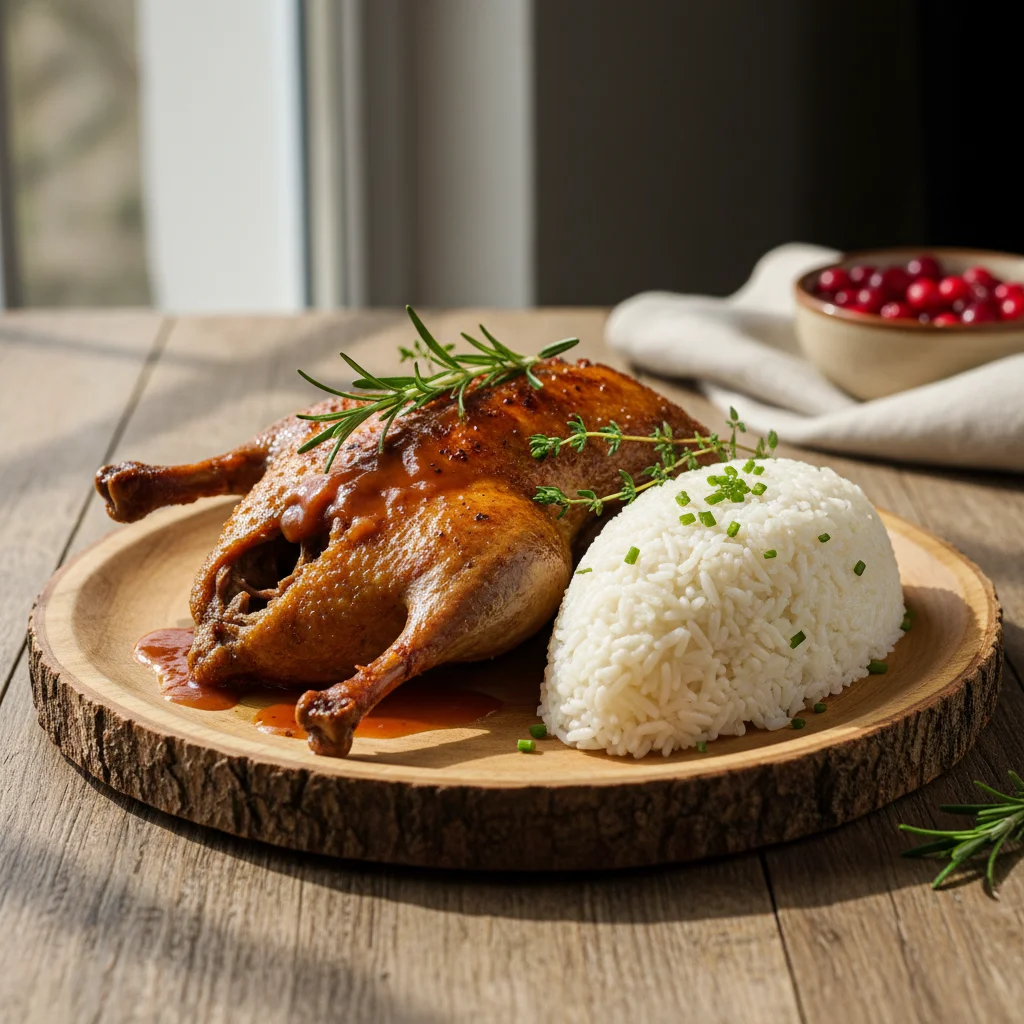 Soczysta kaczka pieczona podawana z delikatnym ryżem białym - idealne danie na każdą okazję.