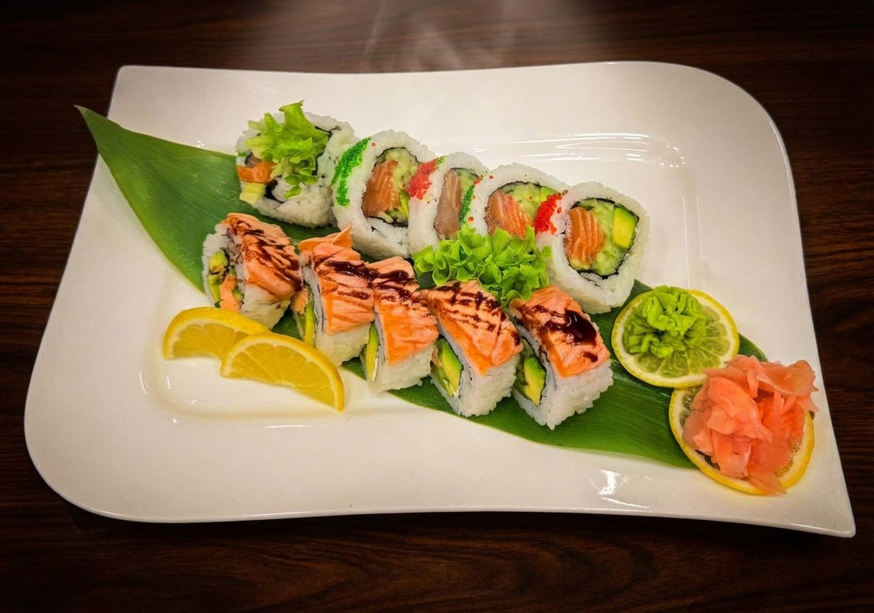 Zestaw sushi z łososiem, awokado i innymi dodatkami. Idealny na lunch lub kolację.