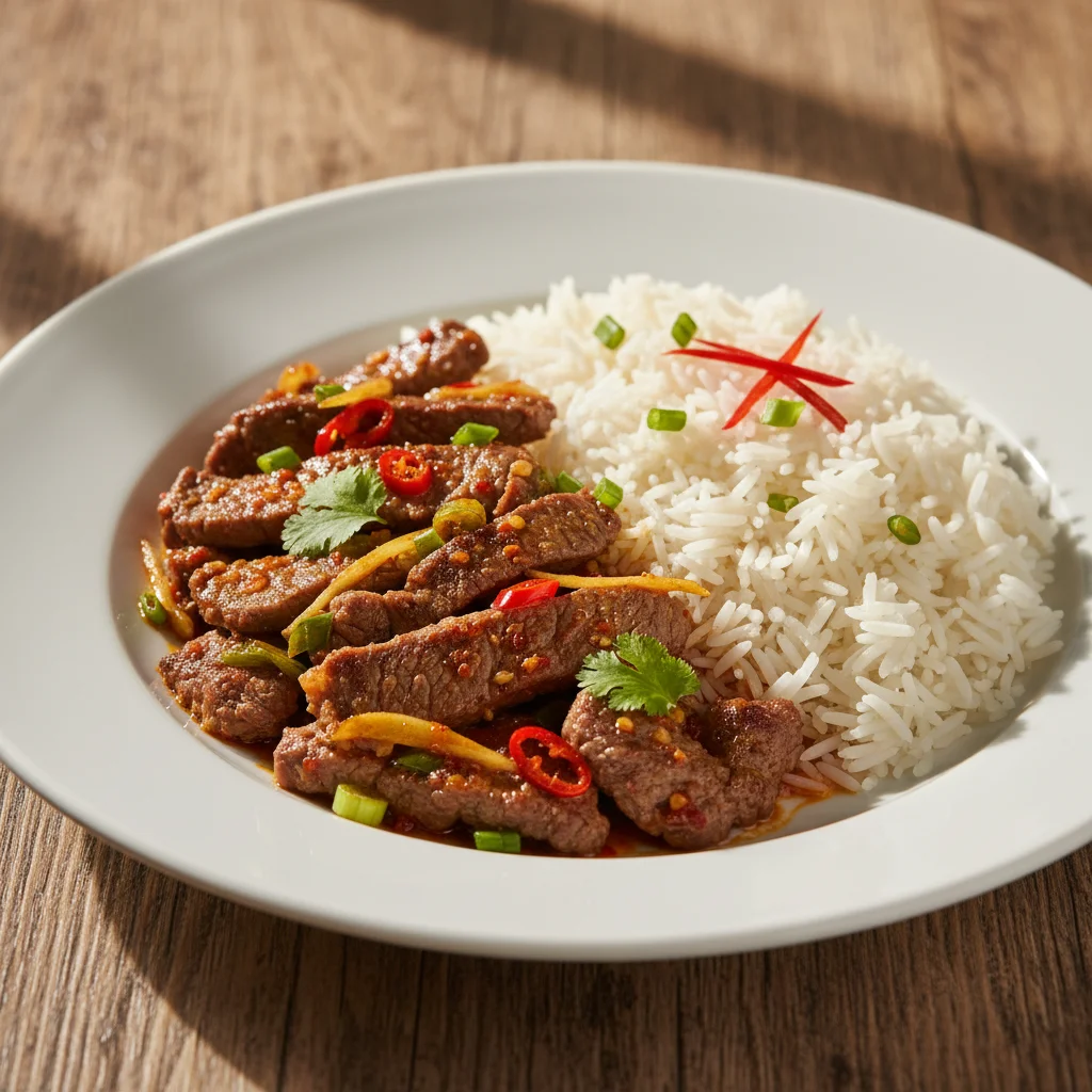 Pikantna wołowina z aromatycznym ryżem białym - idealne danie dla miłośników intensywnych smaków.